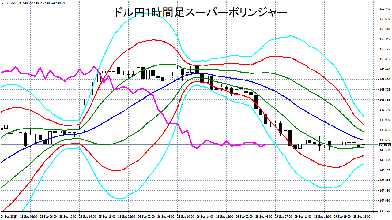 添付チャートは、ドル円の1時間足をスーパーボリンジャーで表示したチャートです。