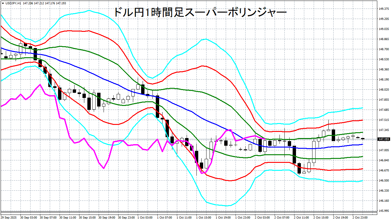 添付チャートは、ドル円の1時間足をスーパーボリンジャーで表示したチャートです。