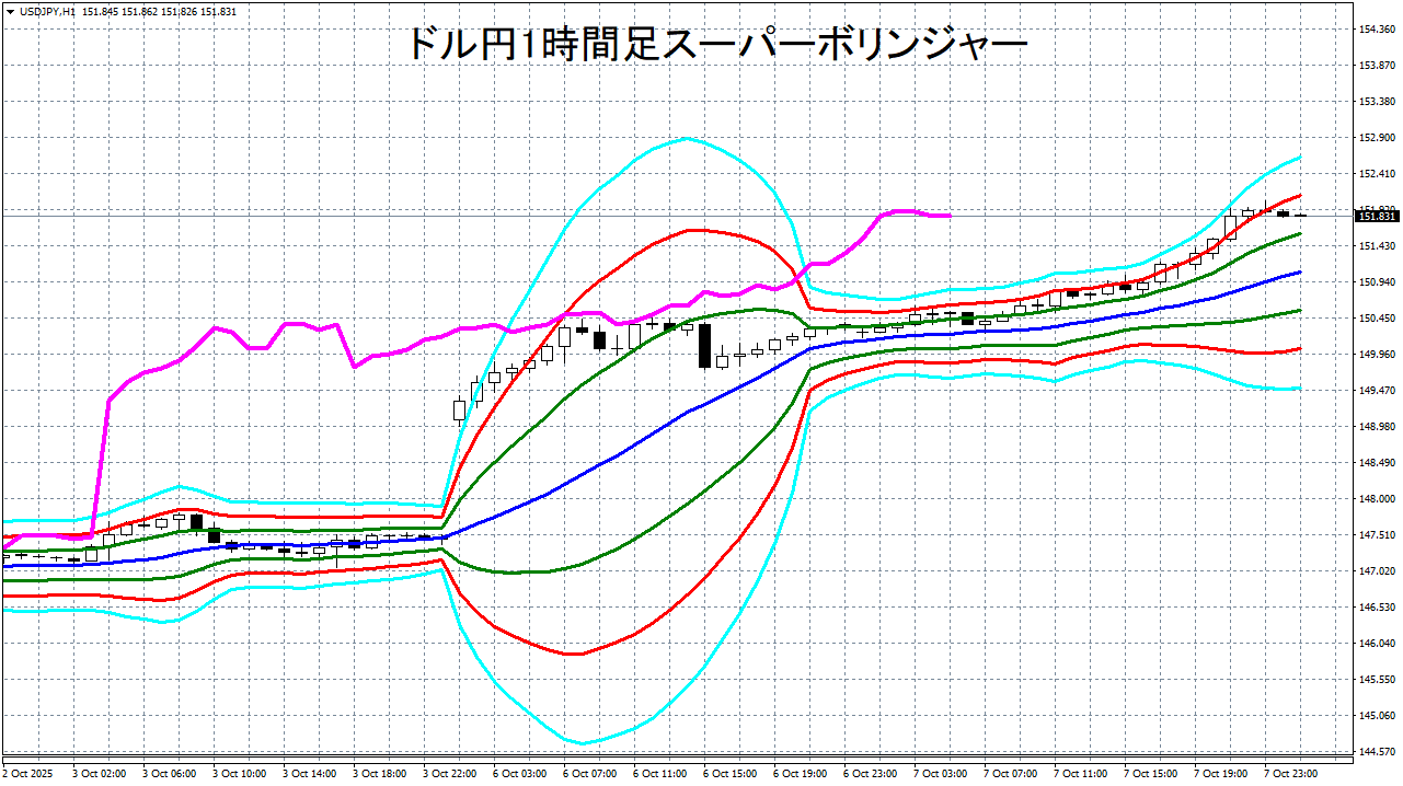 添付チャートは、ドル円の1時間足をスーパーボリンジャーで表示したチャートです。