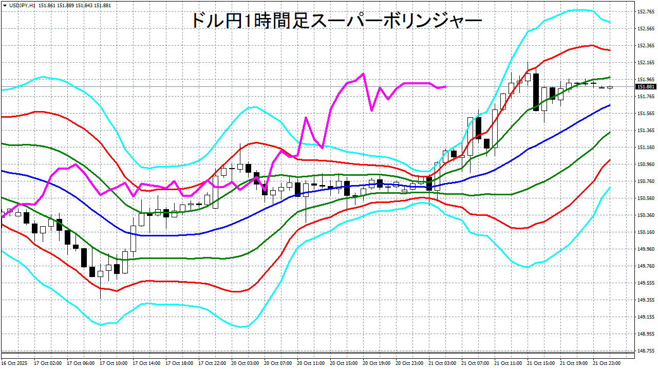 添付チャートは、ドル円の1時間足をスーパーボリンジャーで表示したチャートです。