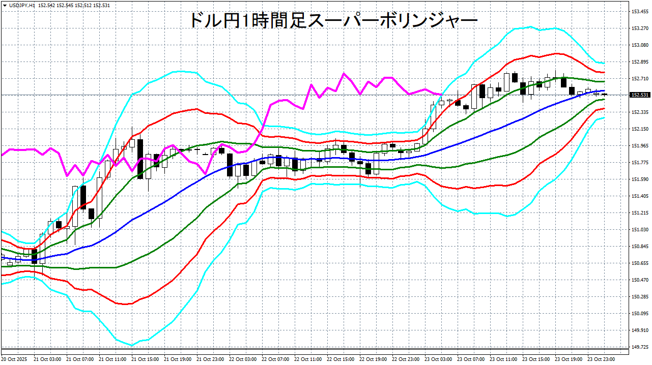 添付チャートは、ドル円の1時間足をスーパーボリンジャーで表示したチャートです。