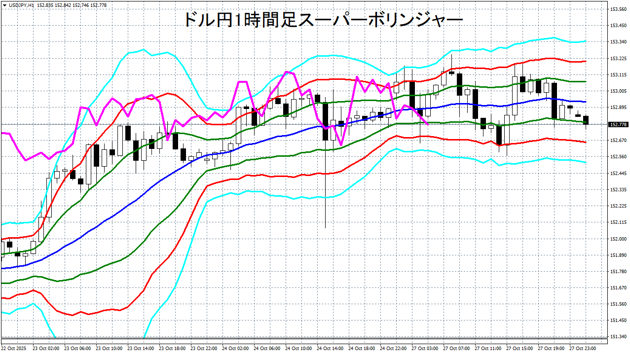 添付チャートは、ドル円の1時間足をスーパーボリンジャーで表示したチャートです。
