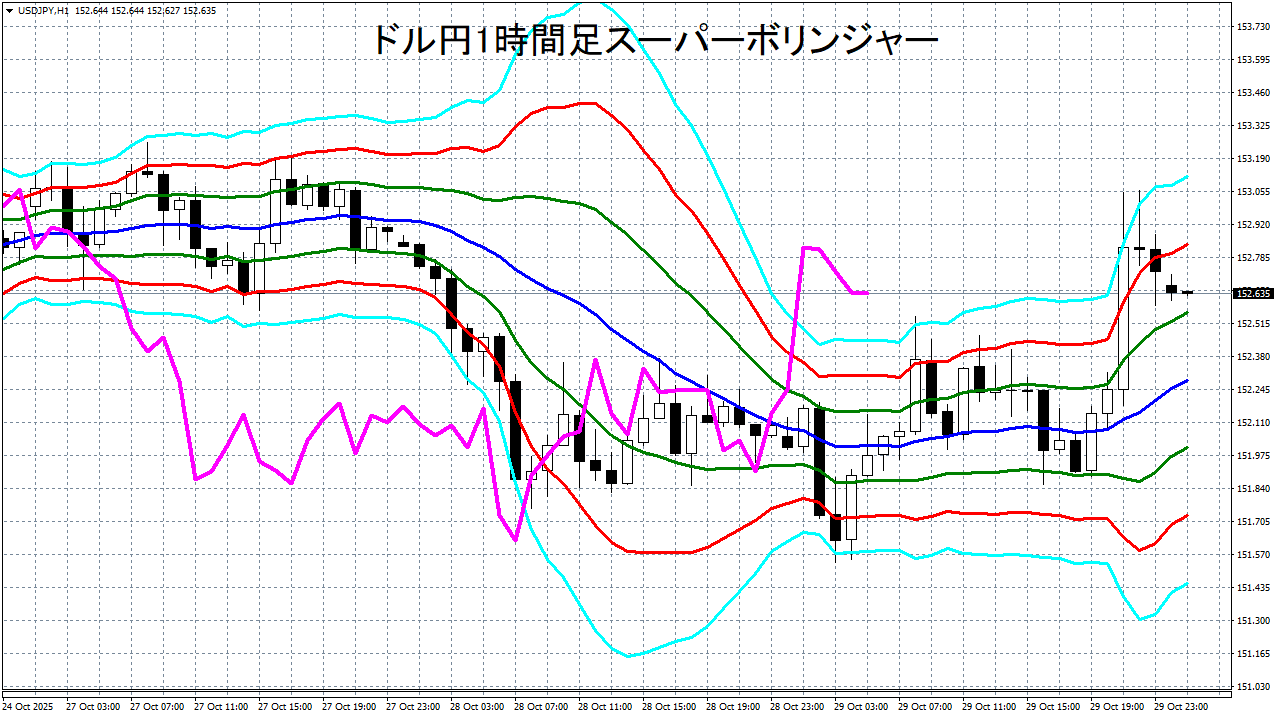 添付チャートは、ドル円の1時間足をスーパーボリンジャーで表示したチャートです。