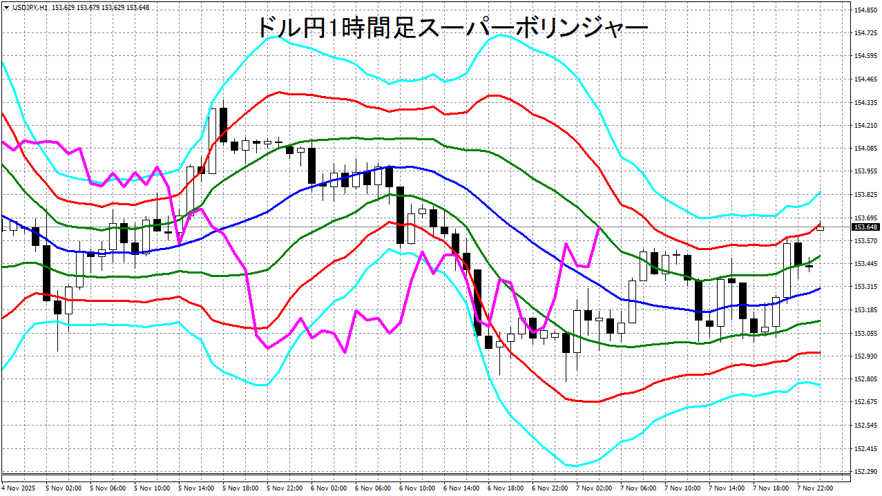 添付チャートは、ドル円の1時間足をスーパーボリンジャーで表示したチャートです。