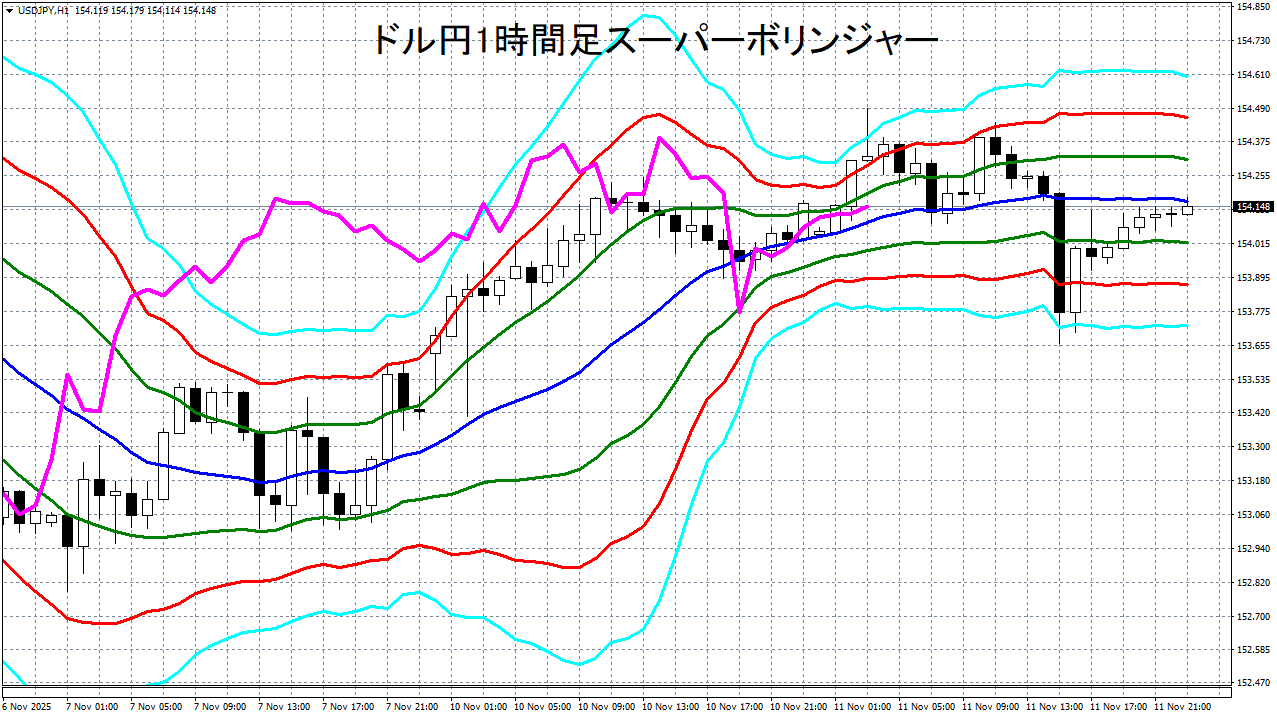 添付チャートは、ドル円の1時間足をスーパーボリンジャーで表示したチャートです。