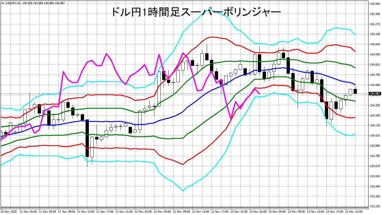 添付チャートは、ドル円の1時間足をスーパーボリンジャーで表示したチャートです。