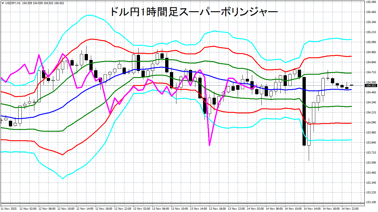 添付チャートは、ドル円の1時間足をスーパーボリンジャーで表示したチャートです。