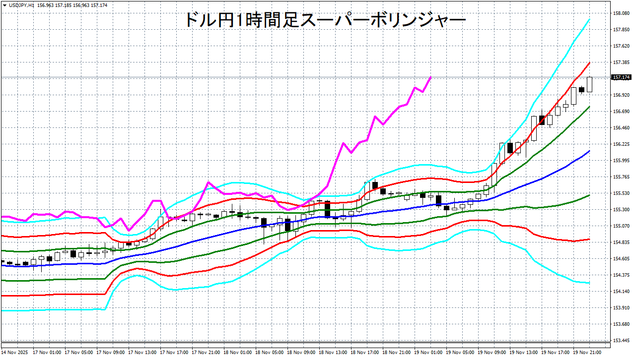 添付チャートは、ドル円の1時間足をスーパーボリンジャーで表示したチャートです。