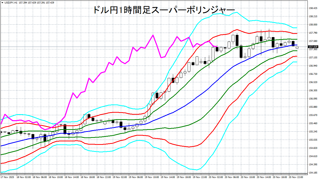 添付チャートは、ドル円の1時間足をスーパーボリンジャーで表示したチャートです。