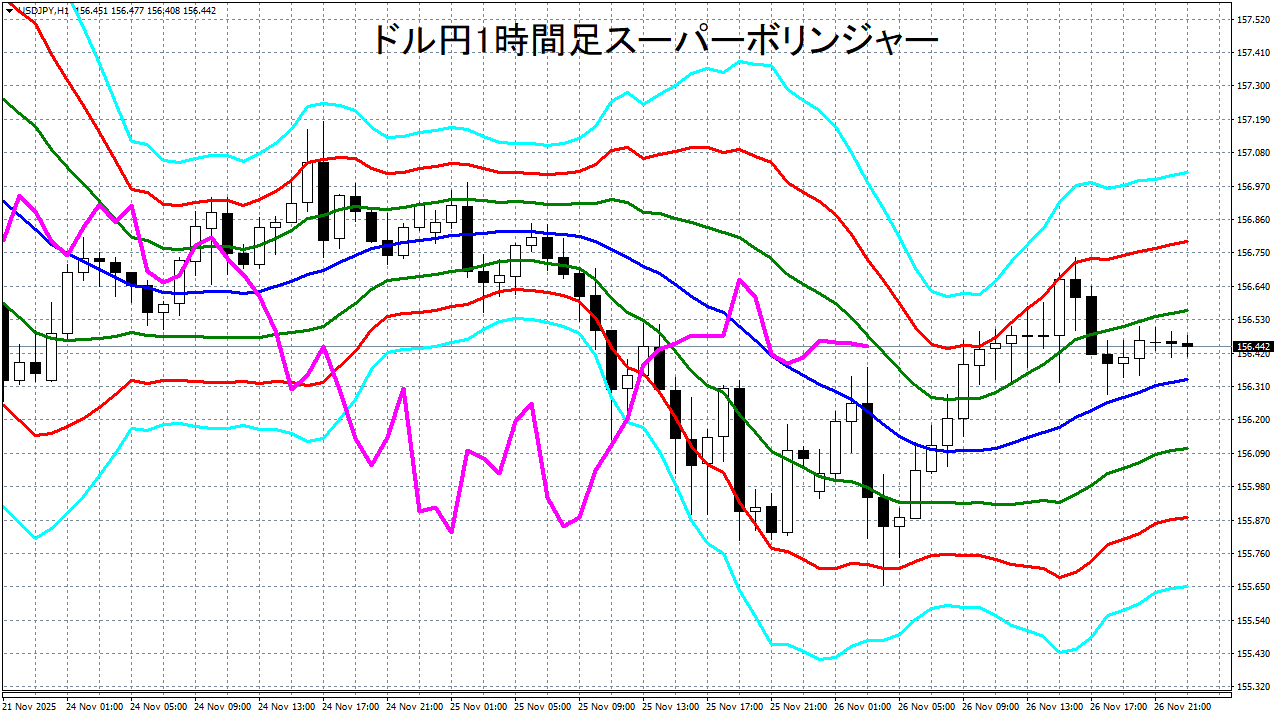 添付チャートは、ドル円の1時間足をスーパーボリンジャーで表示したチャートです。