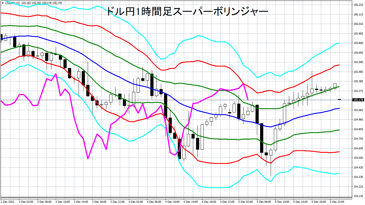 添付チャートは、ドル円の1時間足をスーパーボリンジャーで表示したチャートです。