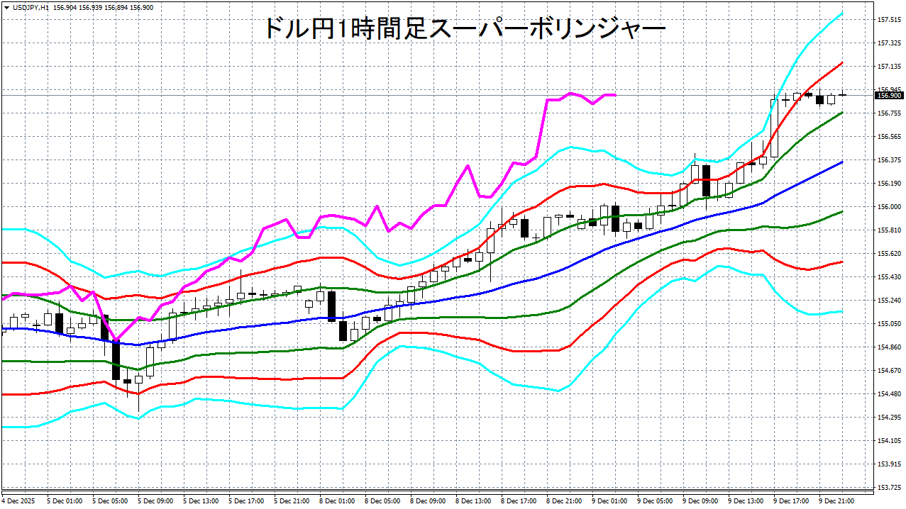 添付チャートは、ドル円の1時間足をスーパーボリンジャーで表示したチャートです。