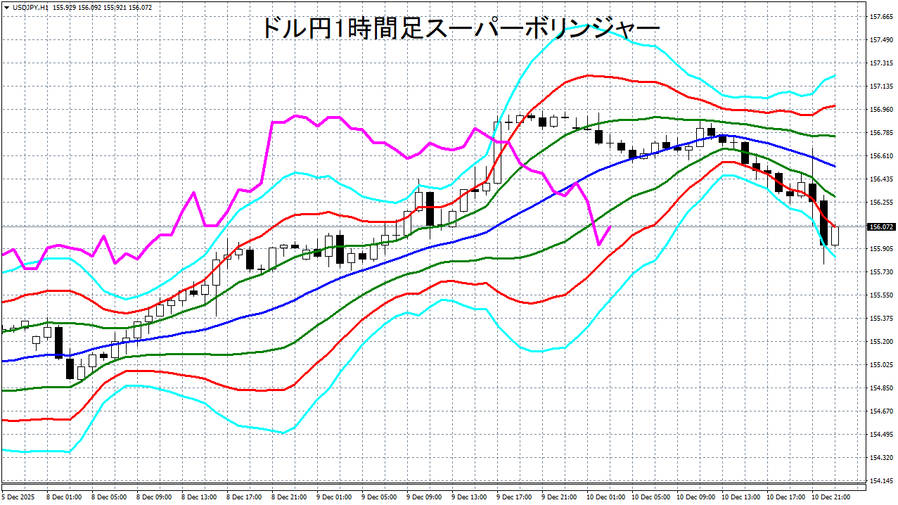 添付チャートは、ドル円の1時間足をスーパーボリンジャーで表示したチャートです。