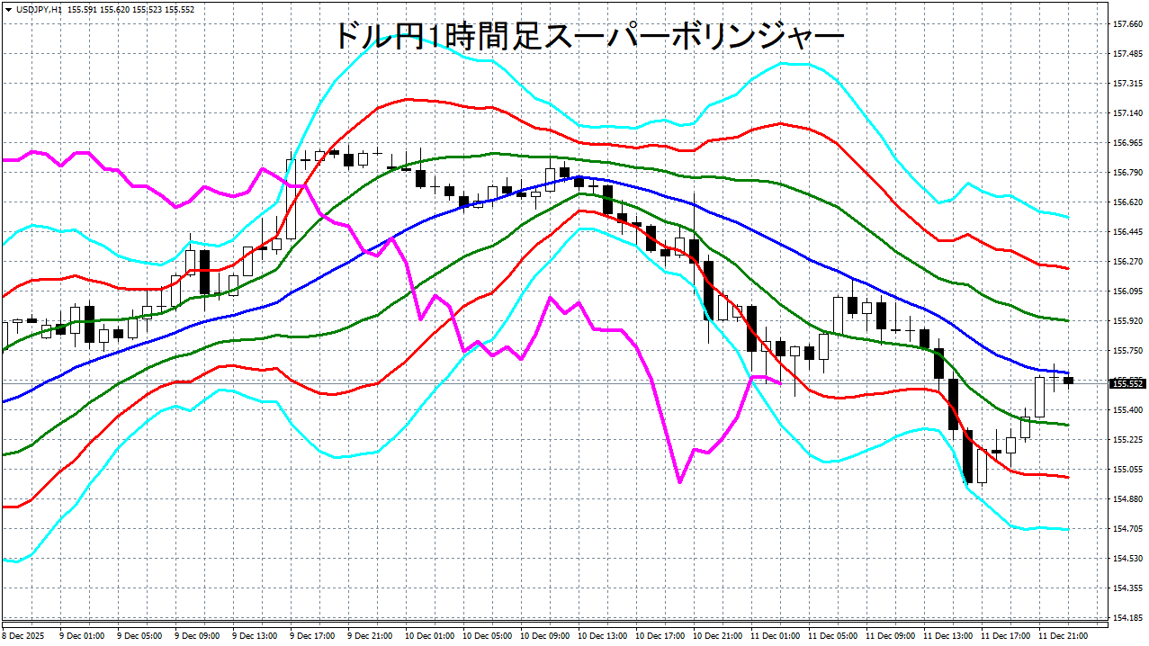 添付チャートは、ドル円の1時間足をスーパーボリンジャーで表示したチャートです。
