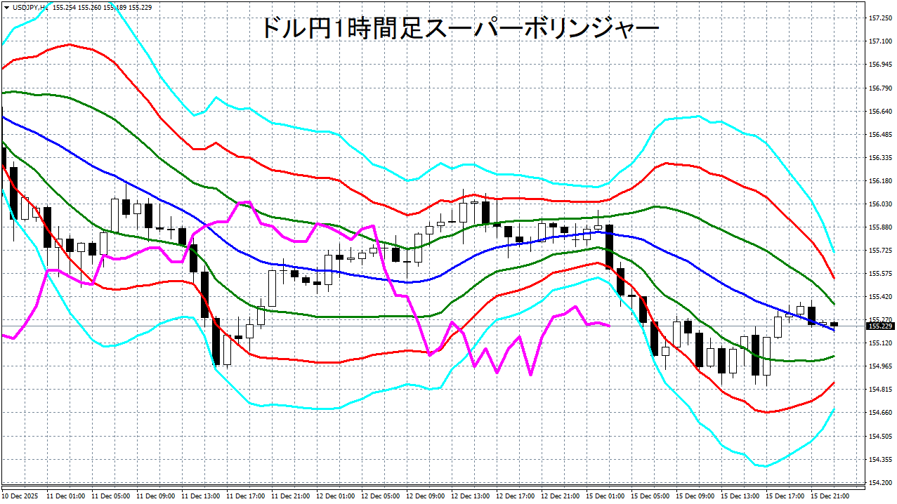 添付チャートは、ドル円の1時間足をスーパーボリンジャーで表示したチャートです。