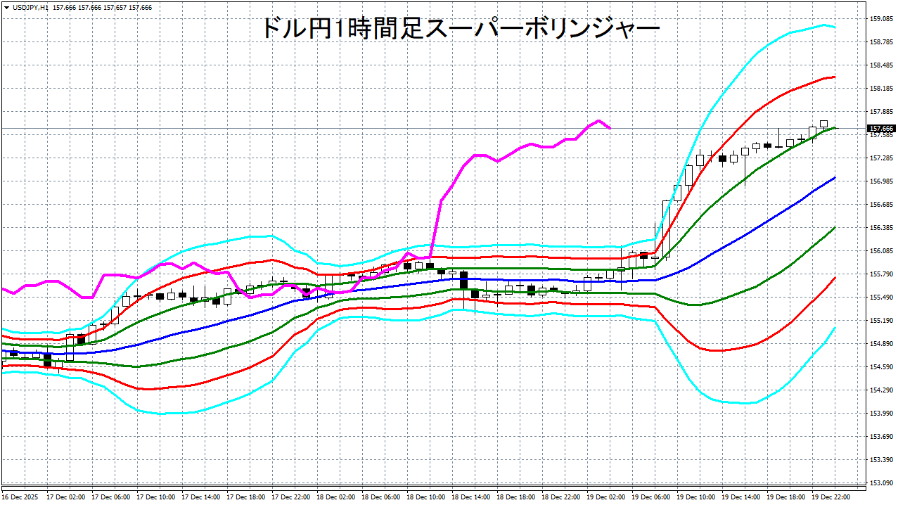 添付チャートは、ドル円の1時間足をスーパーボリンジャーで表示したチャートです。