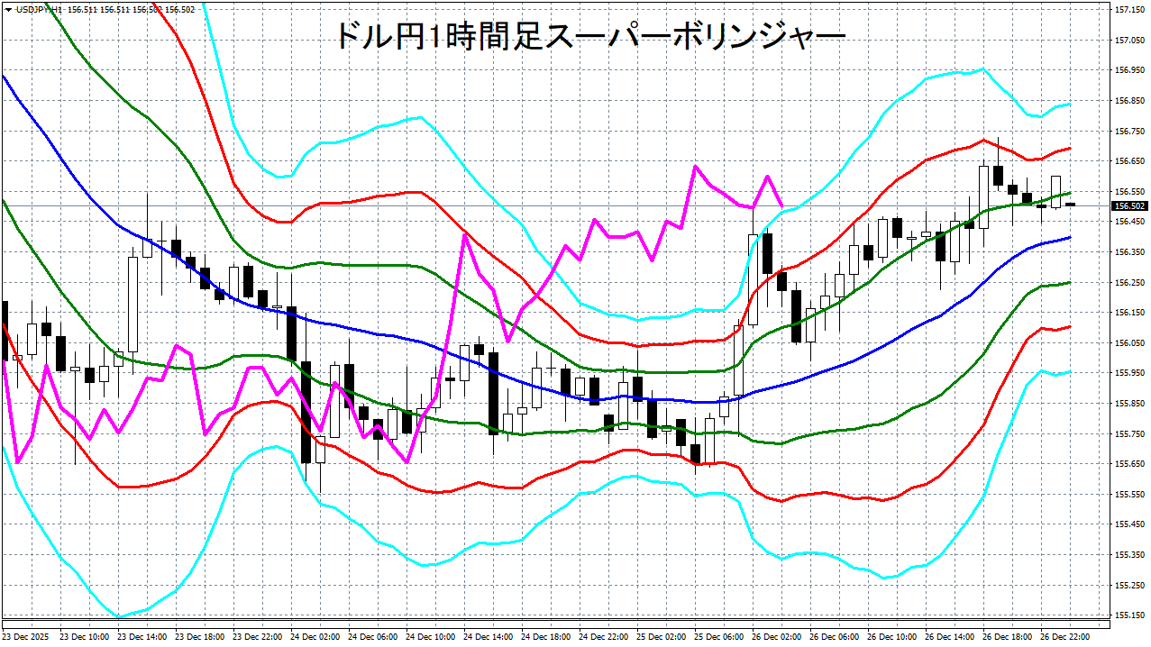 添付チャートは、ドル円の1時間足をスーパーボリンジャーで表示したチャートです。