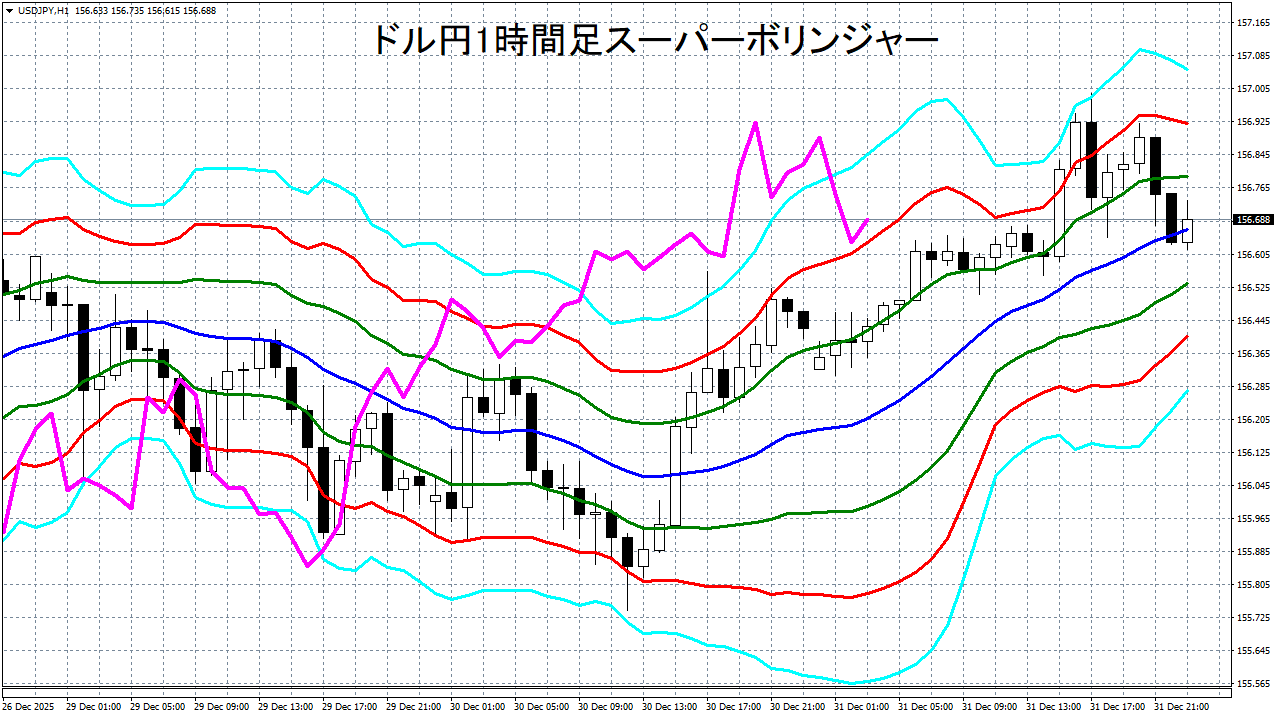 添付チャートは、ドル円の1時間足をスーパーボリンジャーで表示したチャートです。