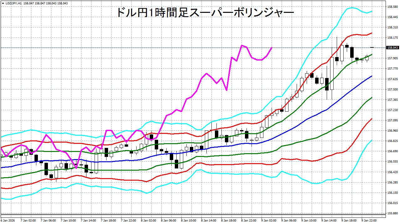 添付チャートは、ドル円の1時間足をスーパーボリンジャーで表示したチャートです。