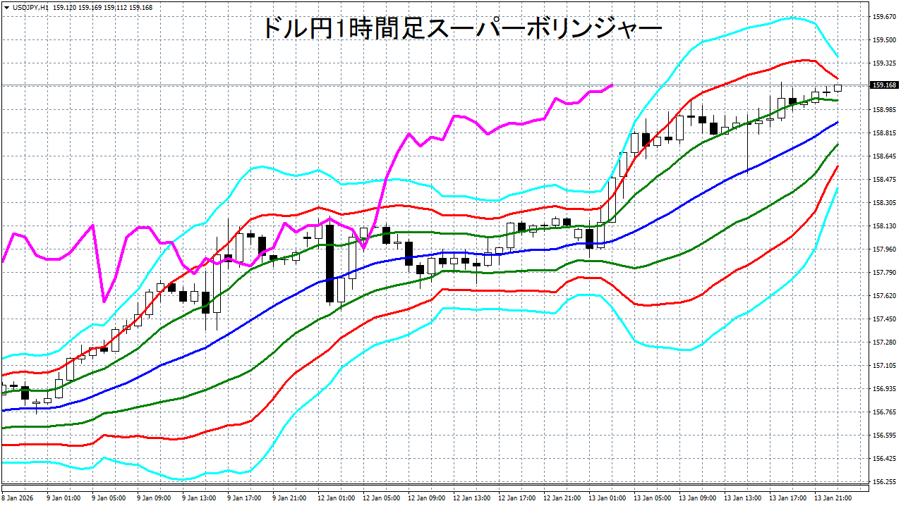 添付チャートは、ドル円の1時間足をスーパーボリンジャーで表示したチャートです。