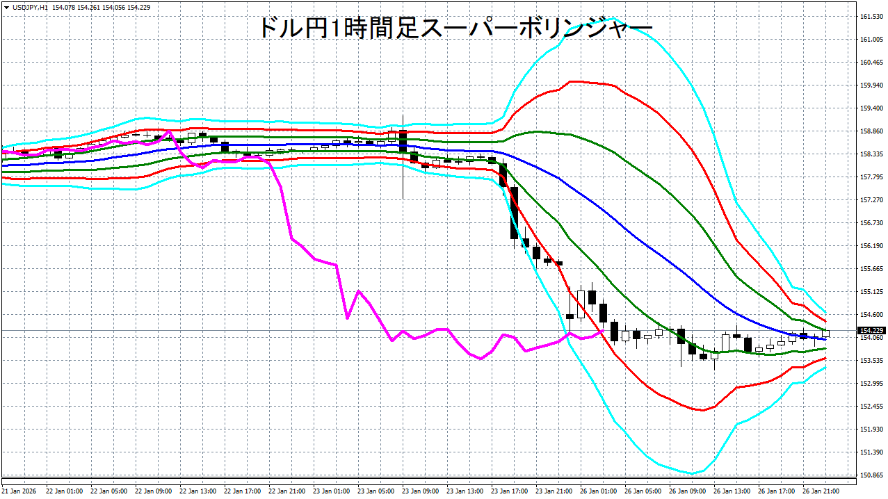 添付チャートは、ドル円の1時間足をスーパーボリンジャーで表示したチャートです。