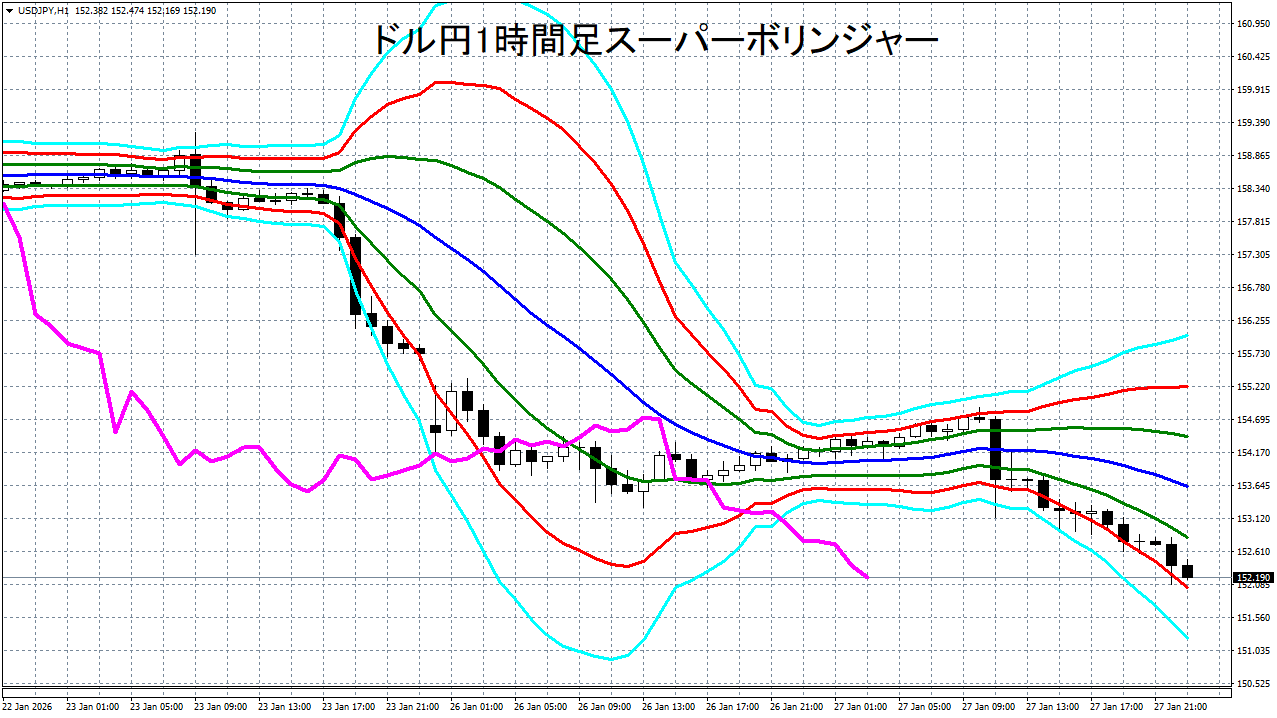 添付チャートは、ドル円の1時間足をスーパーボリンジャーで表示したチャートです。
