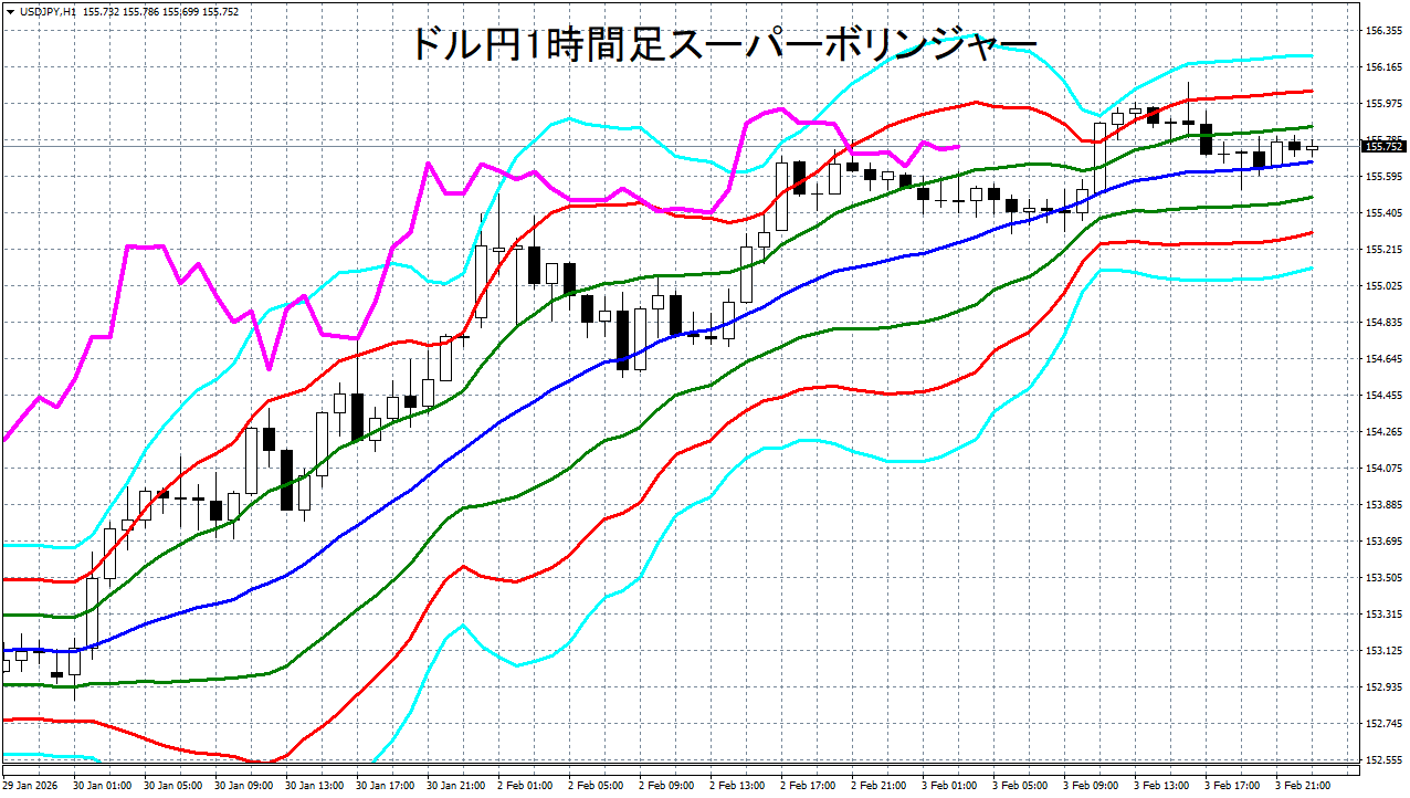 添付チャートは、ドル円の1時間足をスーパーボリンジャーで表示したチャートです。