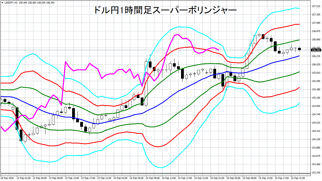 添付チャートは、ドル円の1時間足をスーパーボリンジャーで表示したチャートです。