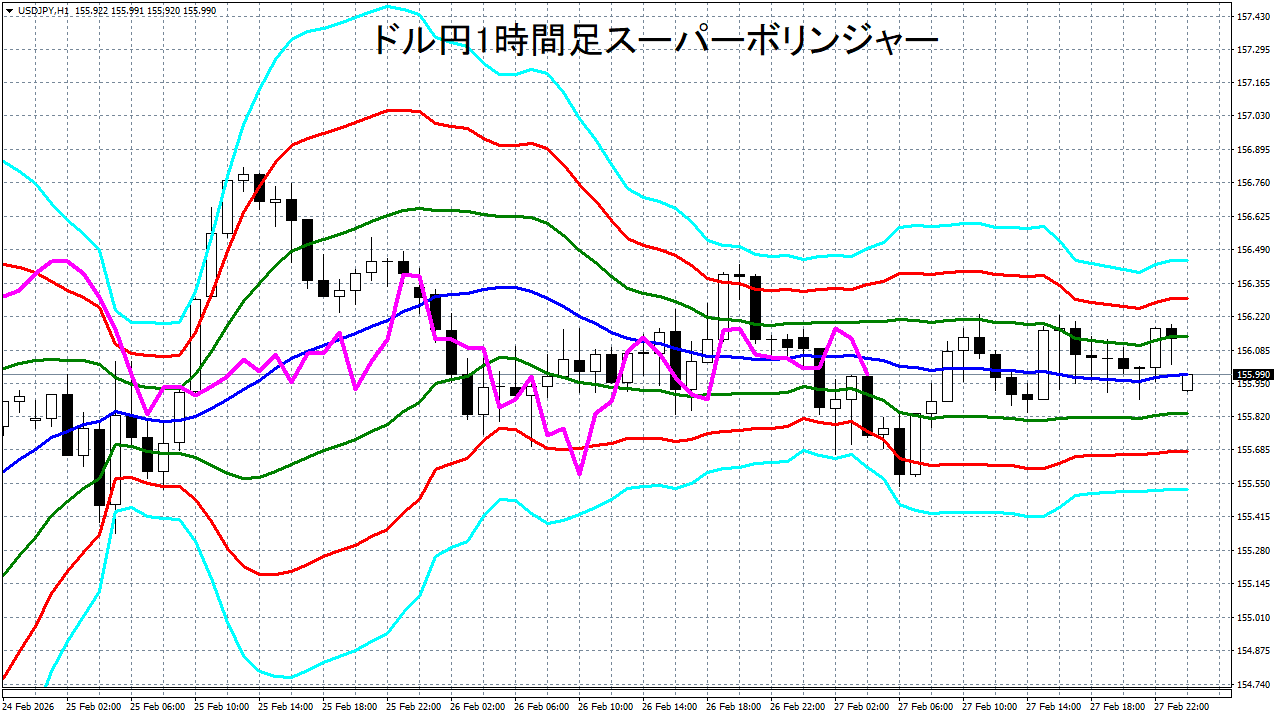添付チャートは、ドル円の1時間足をスーパーボリンジャーで表示したチャートです。