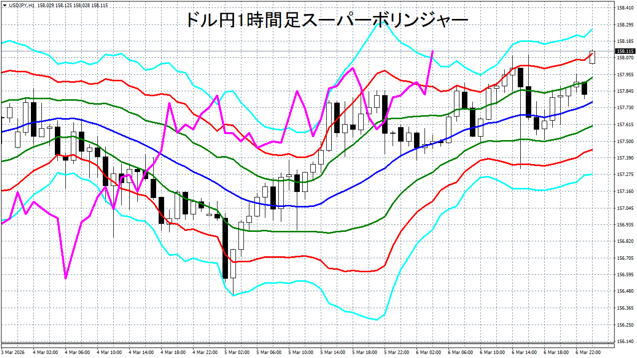 添付チャートは、ドル円の1時間足をスーパーボリンジャーで表示したチャートです。