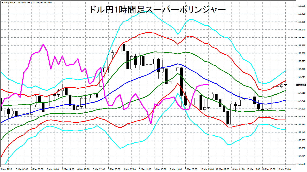 添付チャートは、ドル円の1時間足をスーパーボリンジャーで表示したチャートです。