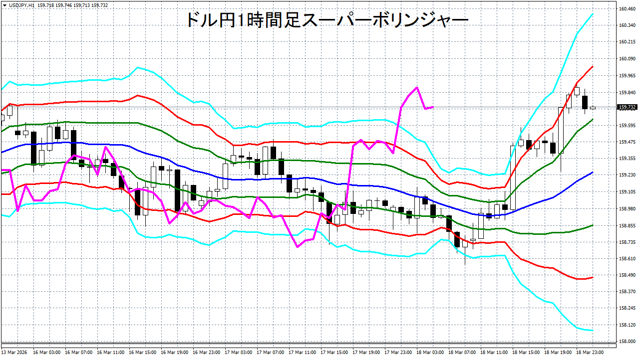 添付チャートは、ドル円の1時間足をスーパーボリンジャーで表示したチャートです。