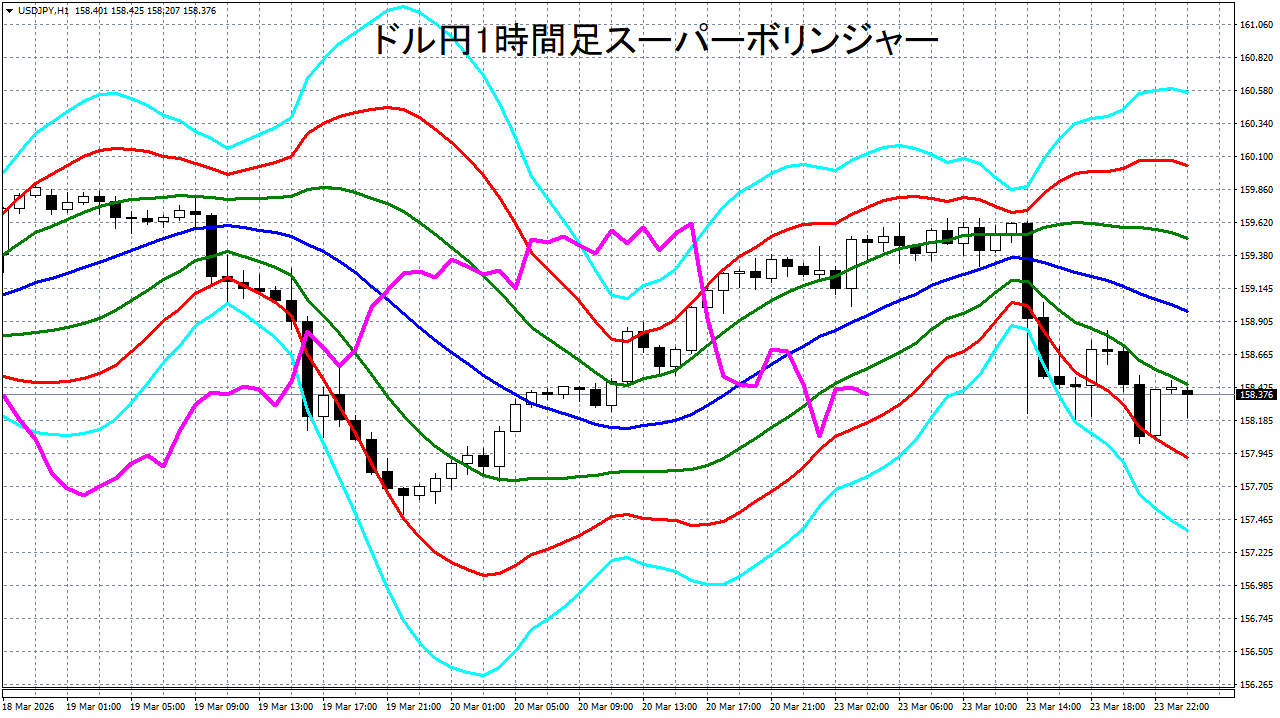 添付チャートは、ドル円の1時間足をスーパーボリンジャーで表示したチャートです。
