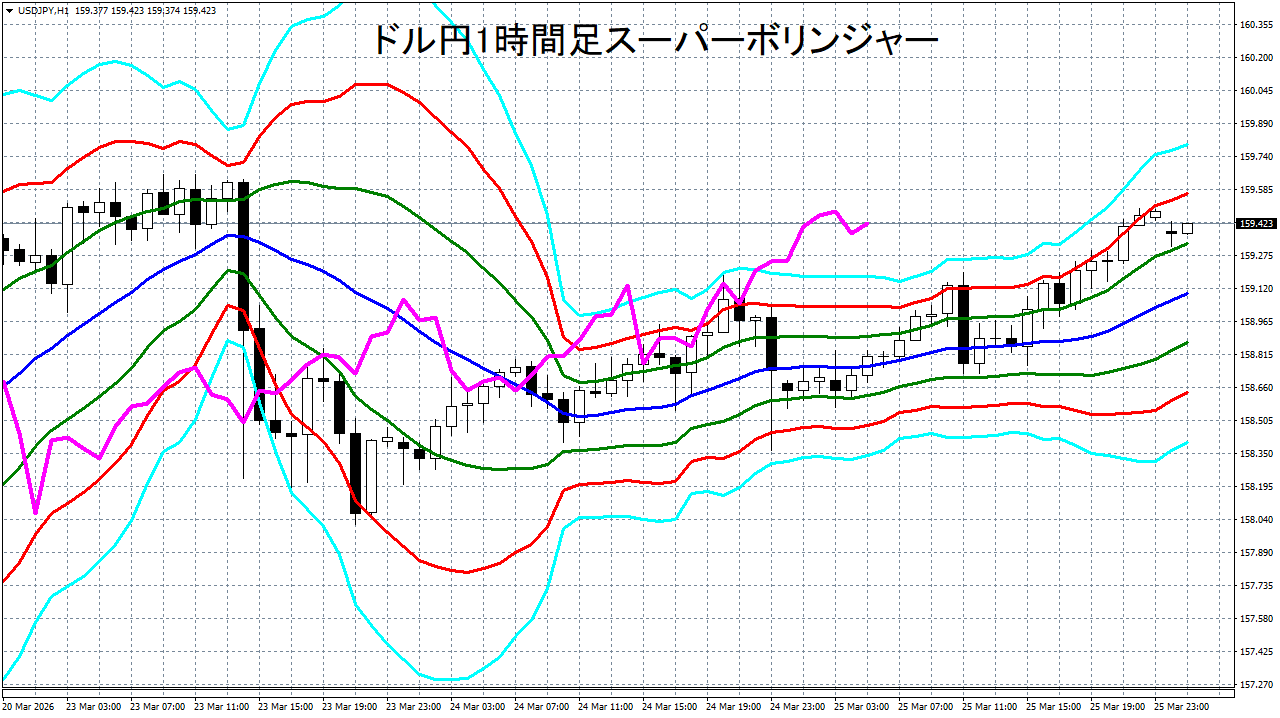 添付チャートは、ドル円の1時間足をスーパーボリンジャーで表示したチャートです。