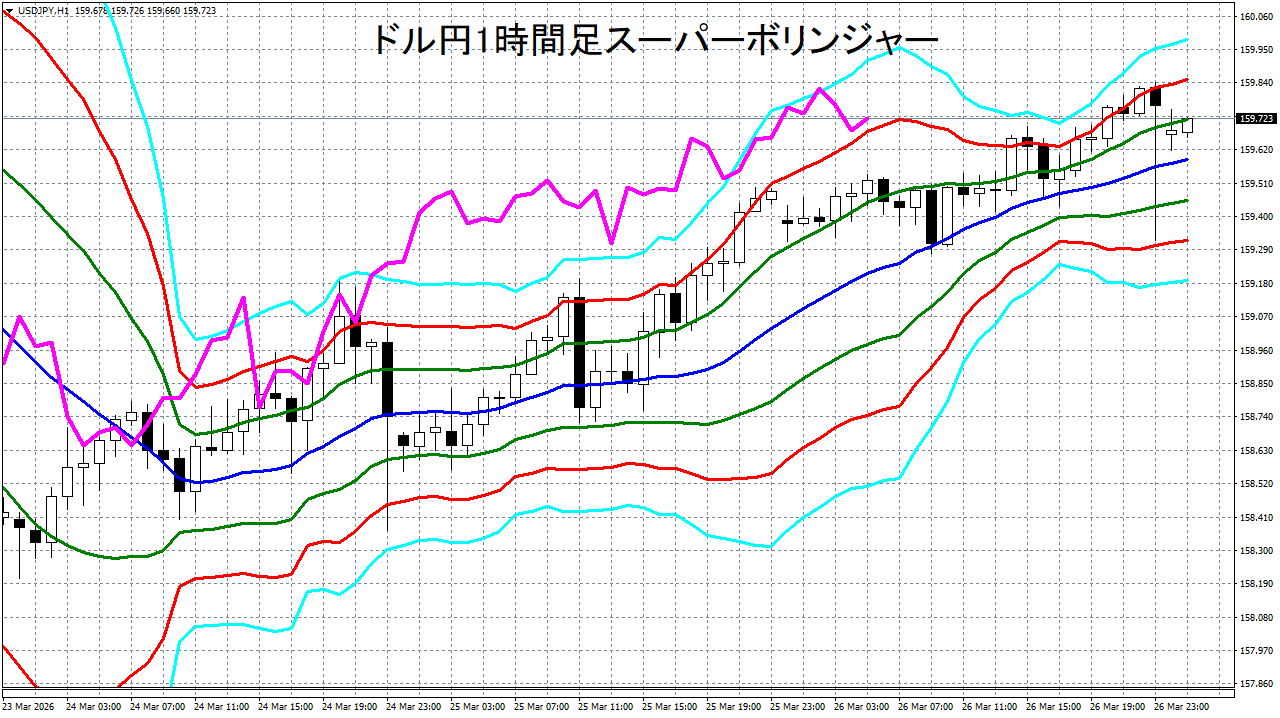 添付チャートは、ドル円の1時間足をスーパーボリンジャーで表示したチャートです。