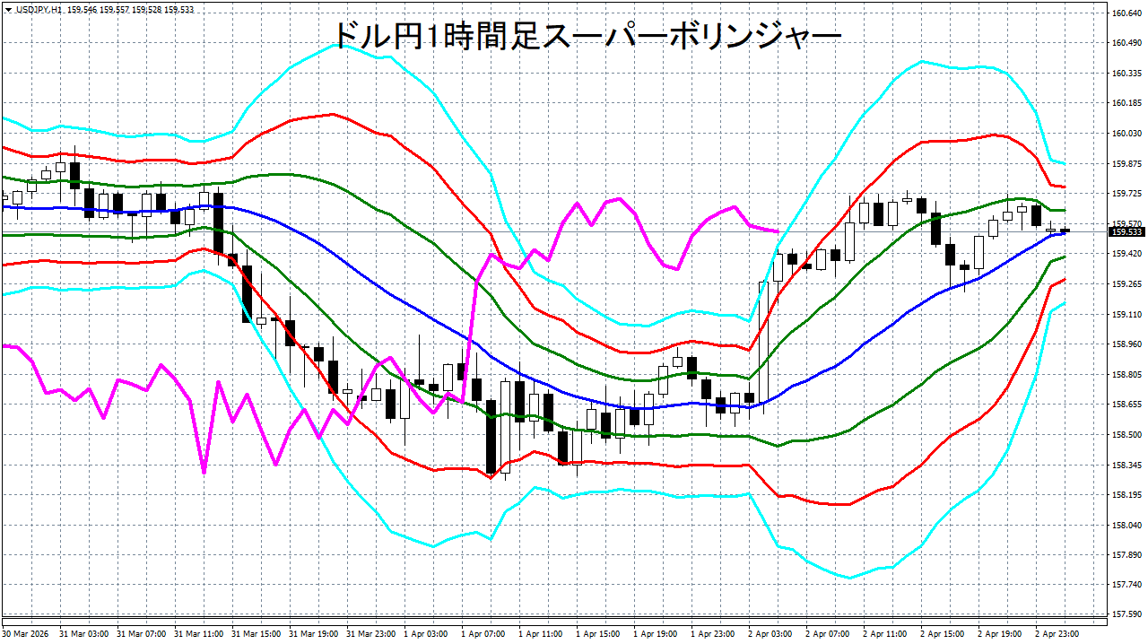 添付チャートは、ドル円の1時間足をスーパーボリンジャーで表示したチャートです。