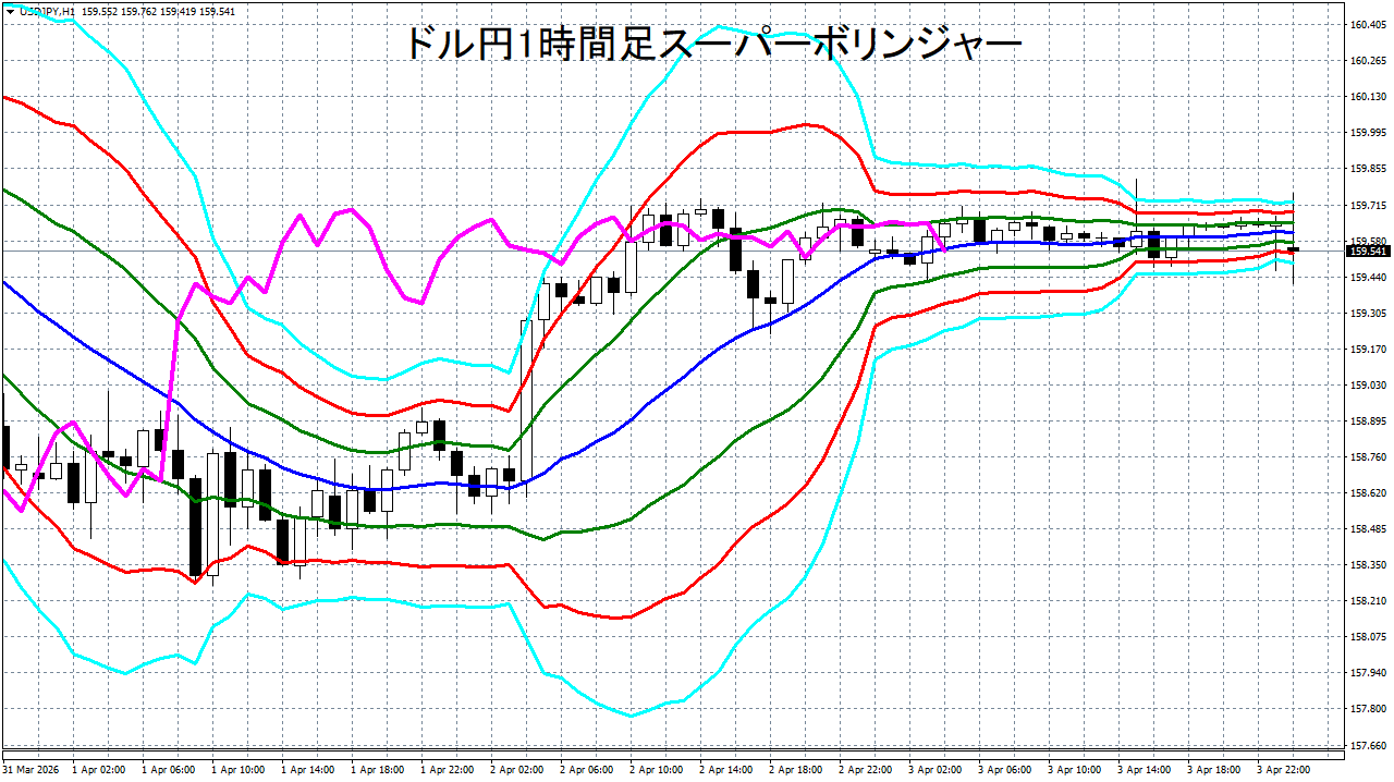 添付チャートは、ドル円の1時間足をスーパーボリンジャーで表示したチャートです。