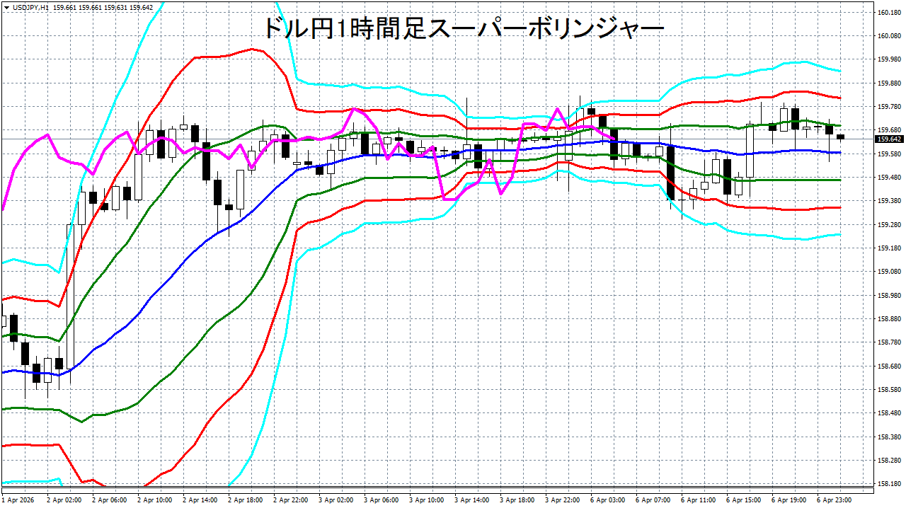 添付チャートは、ドル円の1時間足をスーパーボリンジャーで表示したチャートです。