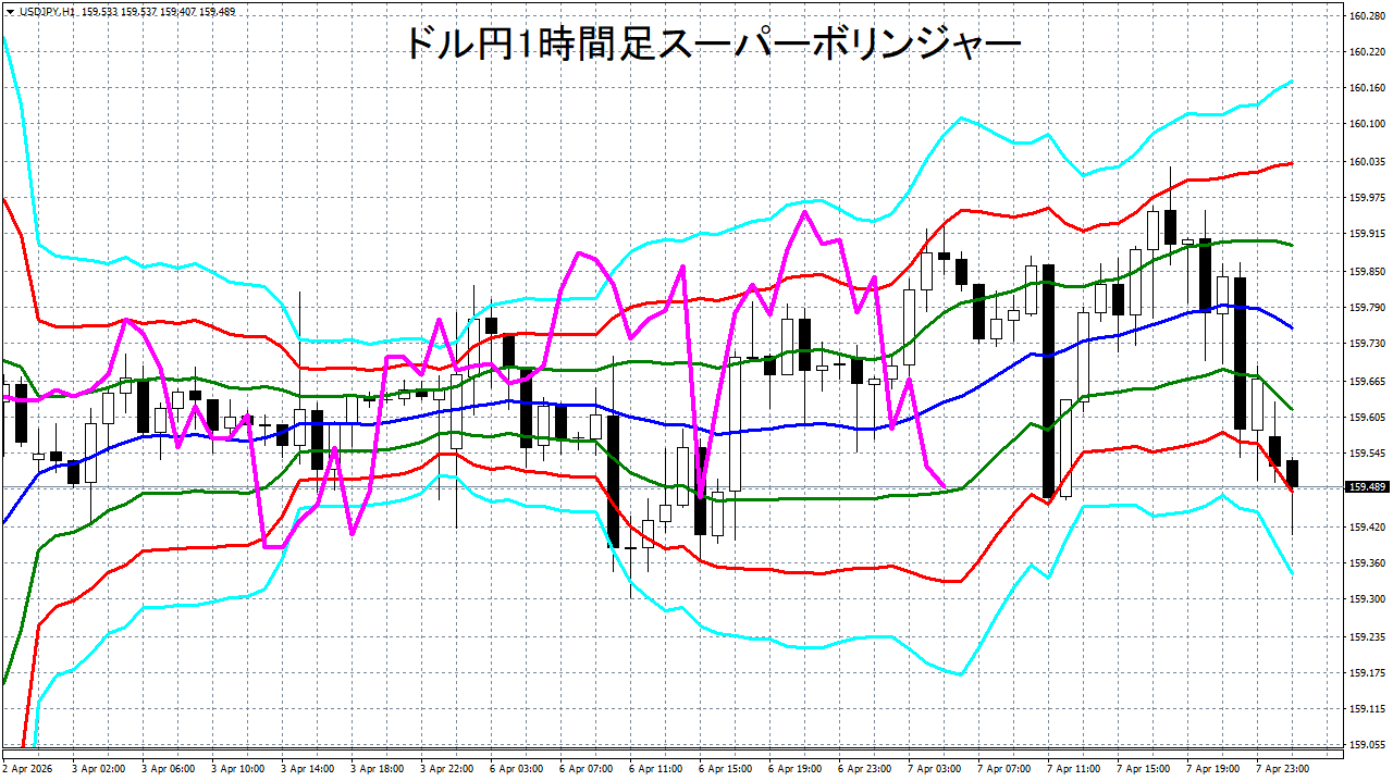 添付チャートは、ドル円の1時間足をスーパーボリンジャーで表示したチャートです。