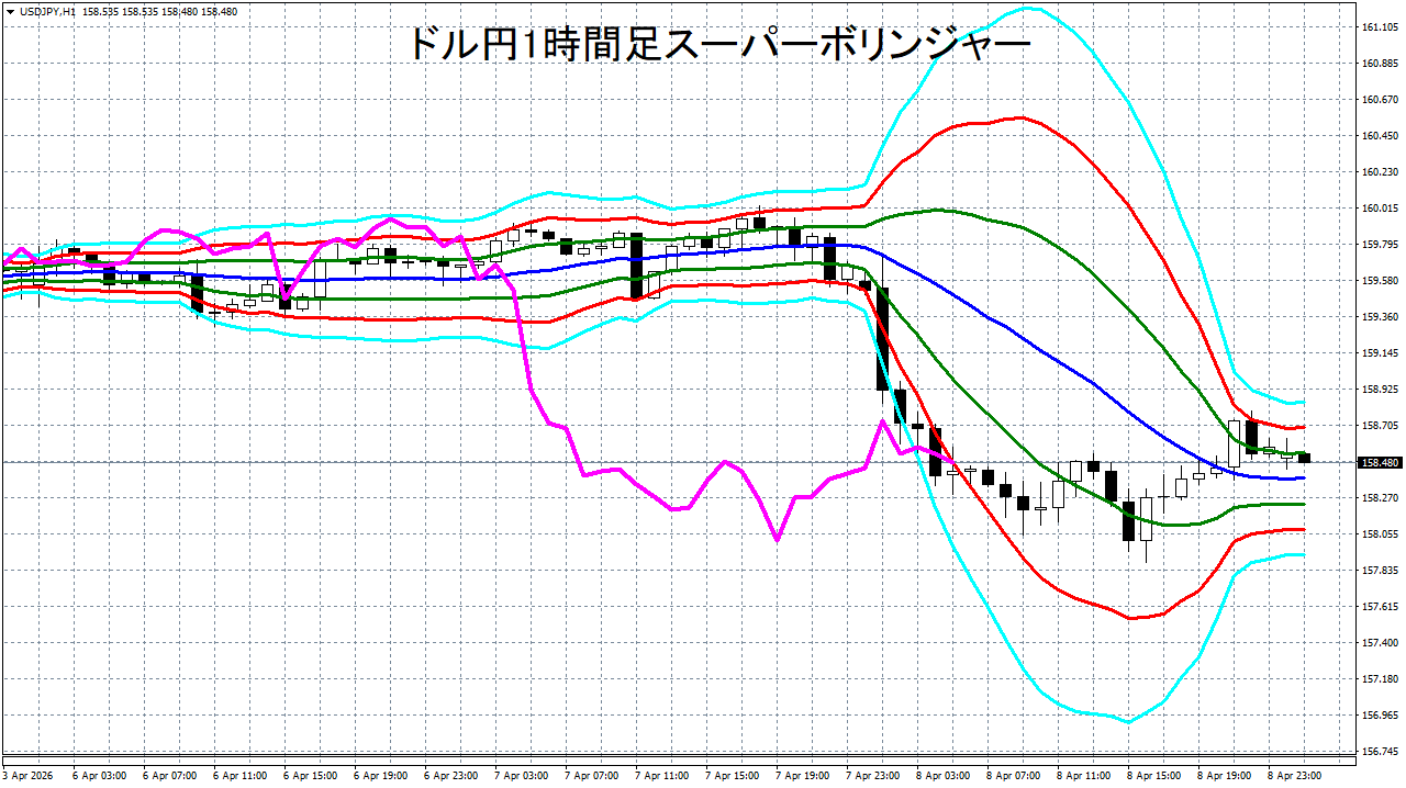 添付チャートは、ドル円の1時間足をスーパーボリンジャーで表示したチャートです。