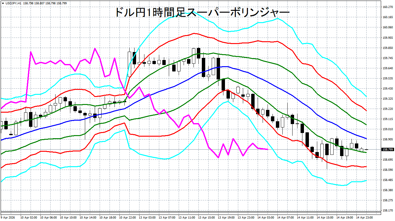 添付チャートは、ドル円の1時間足をスーパーボリンジャーで表示したチャートです。