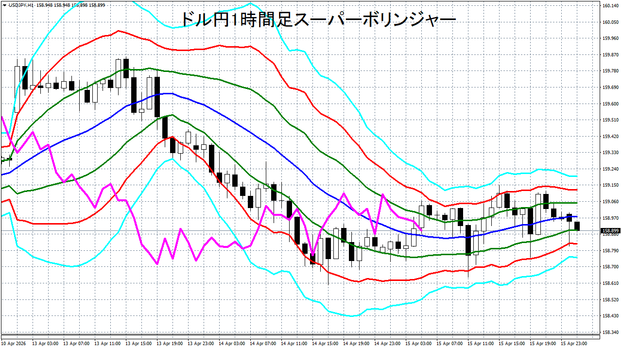 添付チャートは、ドル円の1時間足をスーパーボリンジャーで表示したチャートです。