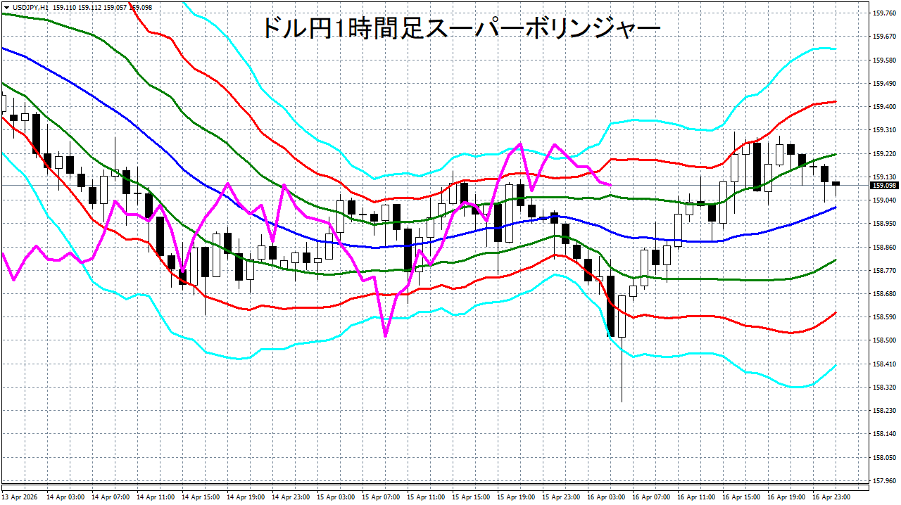 添付チャートは、ドル円の1時間足をスーパーボリンジャーで表示したチャートです。