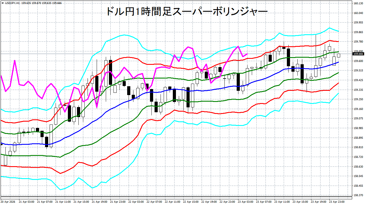 添付チャートは、ドル円の1時間足をスーパーボリンジャーで表示したチャートです。