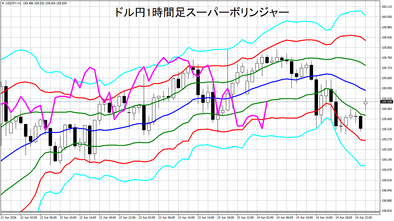 添付チャートは、ドル円の1時間足をスーパーボリンジャーで表示したチャートです。